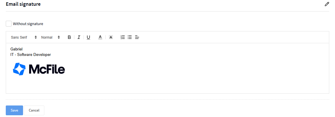 You can define your email signature in the area located below the avatar. There are two options: create it from scratch using the system editor or insert your standard signature with a simple "copy and paste".