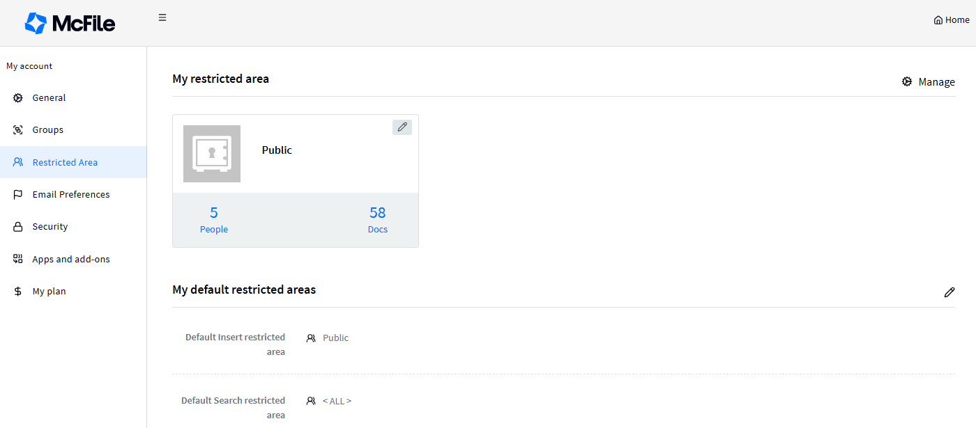 This tab displays all available restricted areas. You can change the default secrecy area for registration and search by clicking the pencil icon positioned in the right corner.