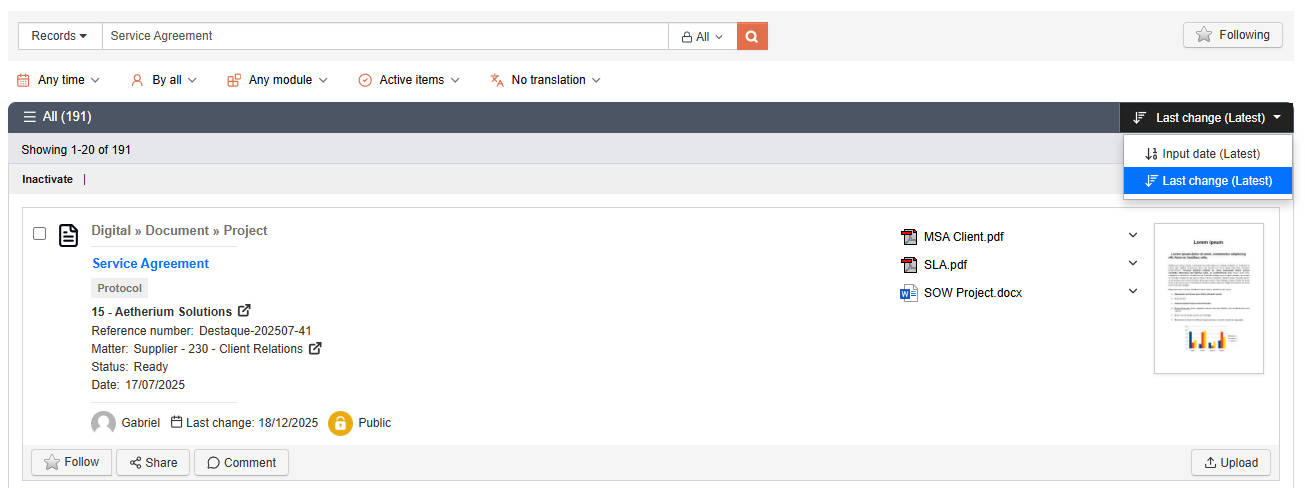 - Registration date – Shows the newest files recently created in the system first.
