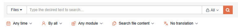 Files can be filtered by date, user, or module. It is also possible to disable the content search to search only by the file name. This last option is useful, for example, to refine a search that returned too many results.