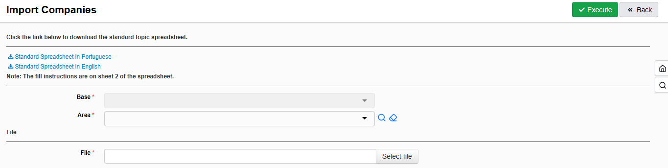 Data import allows for the creation of multiple records at once, eliminating the need for individual manual registrations. The process uses a spreadsheet with pre-defined columns where each filled row corresponds to a new record to be inserted into the system. It is important to note that each spreadsheet template is specific to a single register type.