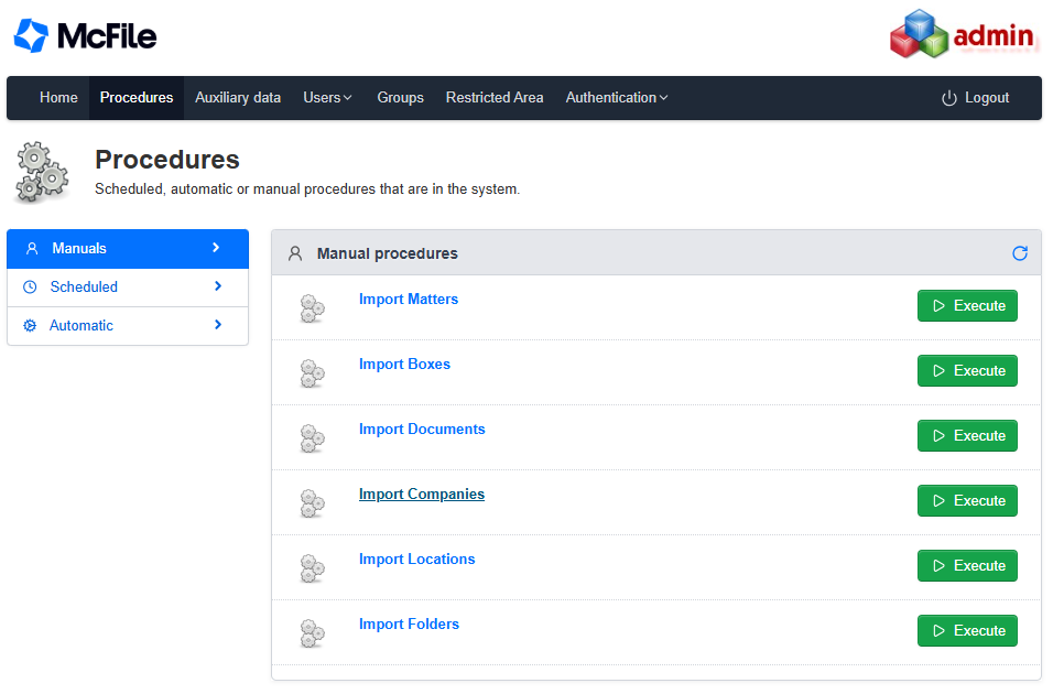 The usage of import procedures is exclusive to users with Administrator permissions.