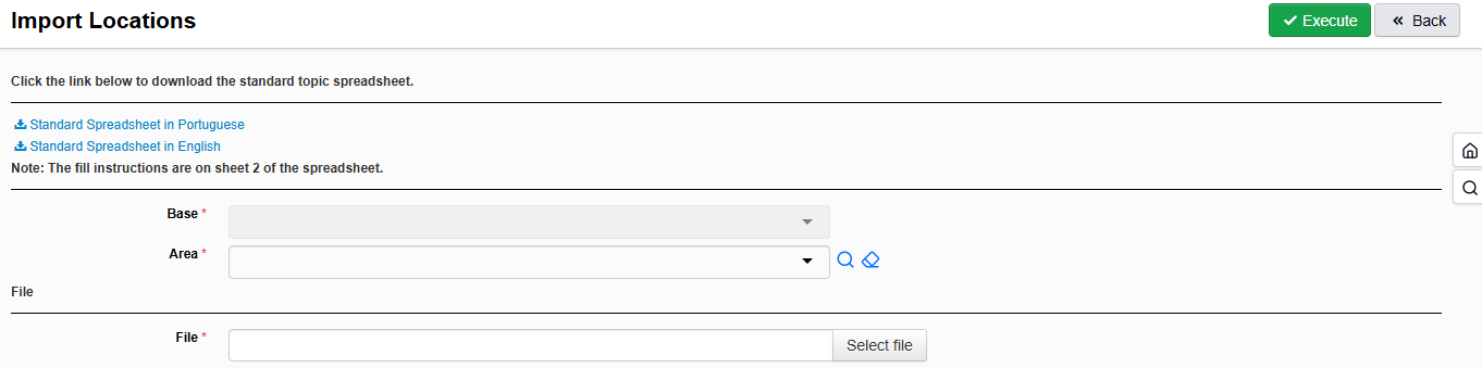 Data import allows for the creation of multiple records at once, eliminating the need for individual manual registrations. The process uses a spreadsheet with pre-defined columns where each filled row corresponds to a new record to be inserted into the system. It is important to note that each spreadsheet template is specific to a single register type.