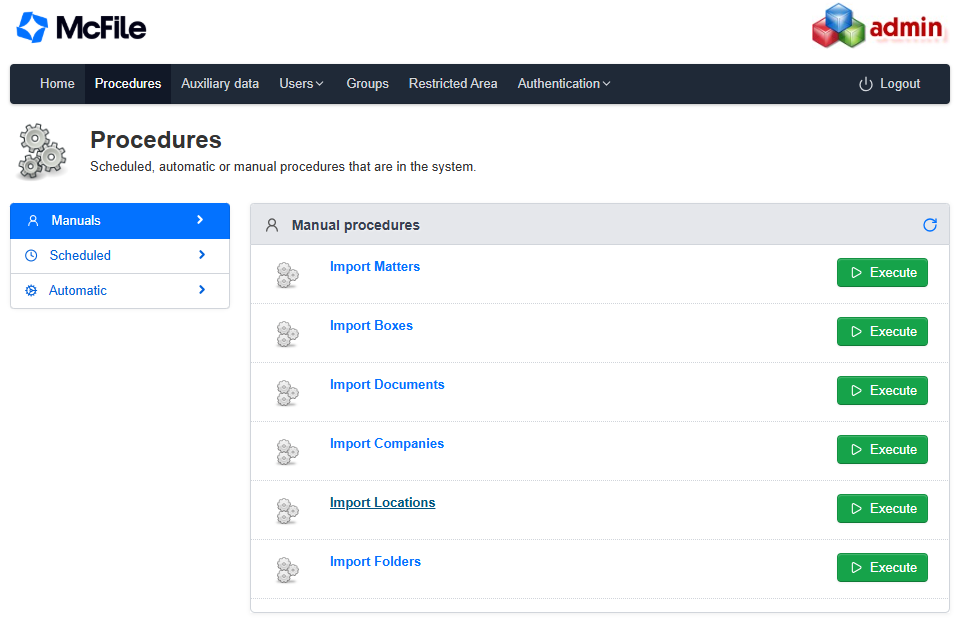 The usage of import procedures is exclusive to users with Administrator permissions.