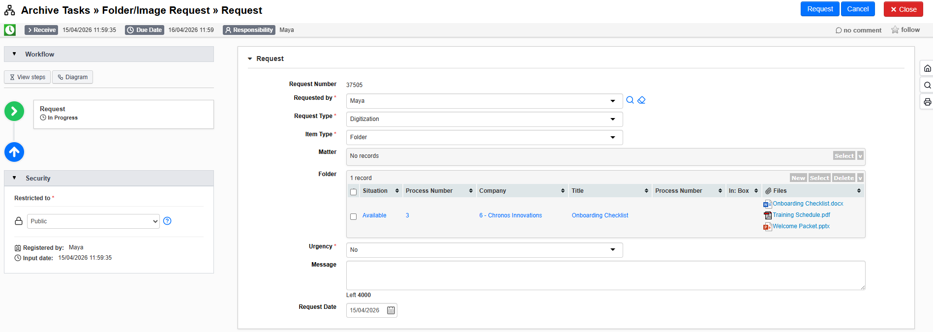 The request workflow can also be accessed directly through the navigation menu. To do this, go to Input (+) > Archive Tasks > Folder/Image Request.