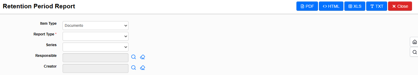 2. Fill in the optional fields Item Type, Series, Responsible, and Creator if you need to filter the result by specific criteria.